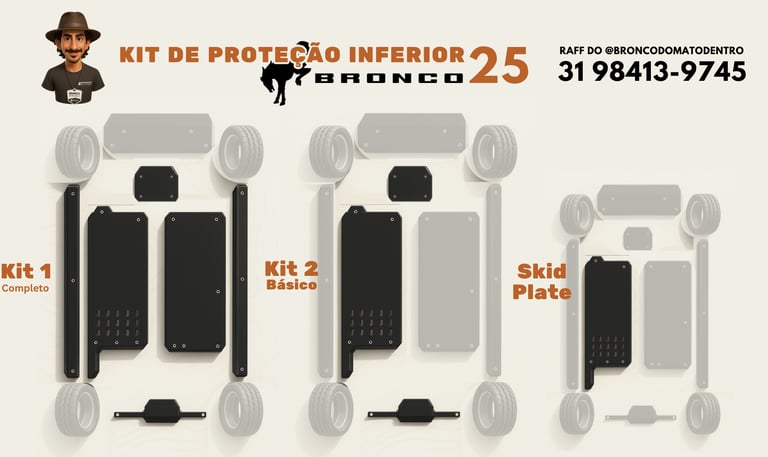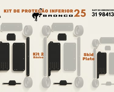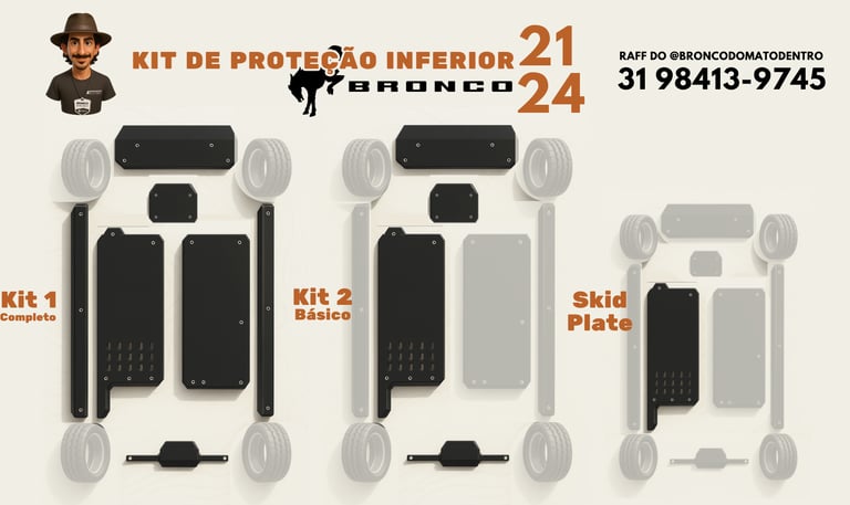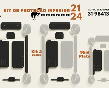 Para os modelos 2021 a 2024, são 7 proteções inferiores que formam o kit mais completo do Brasil, disponíveis nas versões Iniciante, Básico e o Completo para aproveitar melhor do seu Bronco no offroad considerando que estas proteções são de fácil instalação e podem ser feitas em qualquer oficina de bairro.
